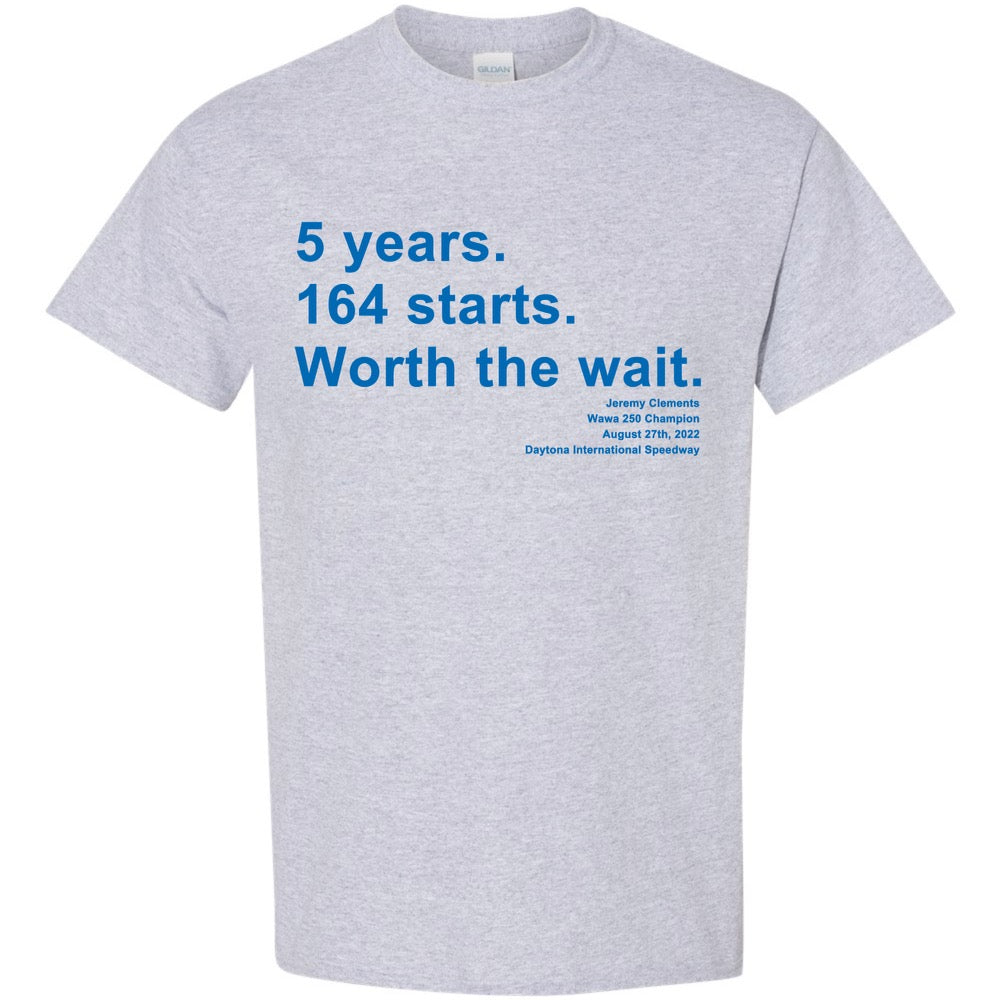 Heather gray shirts feature the details between Jeremy’s two wins on the front, the JCR logo on one sleeve and the 51 on the other sleeve.