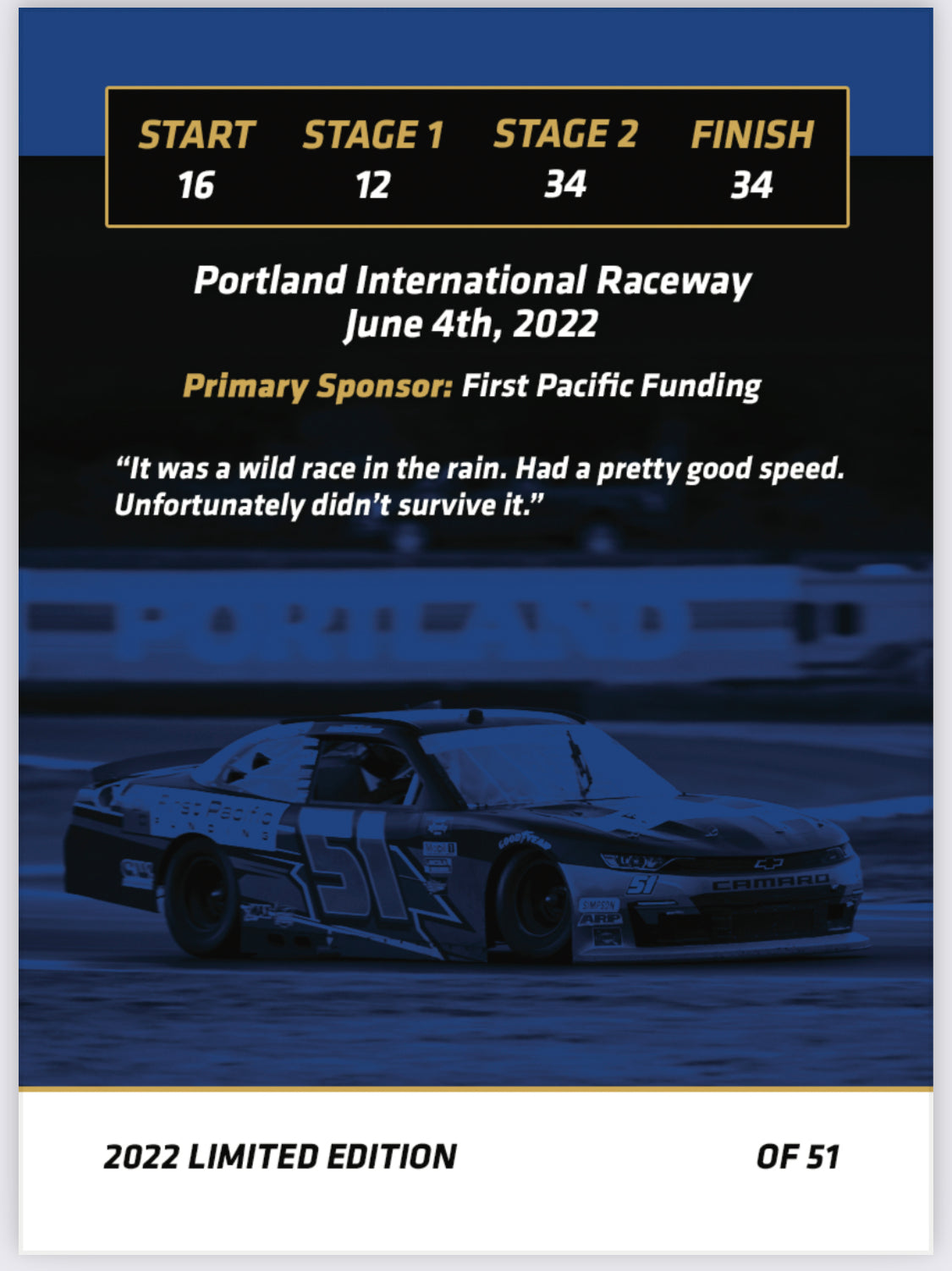 There will be 51 cards for each of the 33 races in 2022. Each card in the series will feature a photo from the race as well as a recap/highlights from the race as well as listing the starting and finishing position. Each card will be hand numbered “x of 51”. Jeremy will then sign each card.