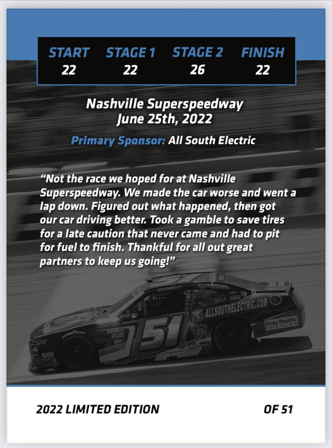 There will be 51 cards for each of the 33 races in 2022. Each card in the series will feature a photo from the race as well as a recap/highlights from the race as well as listing the starting and finishing position. Each card will be hand numbered “x of 51”. Jeremy will then sign each card.
