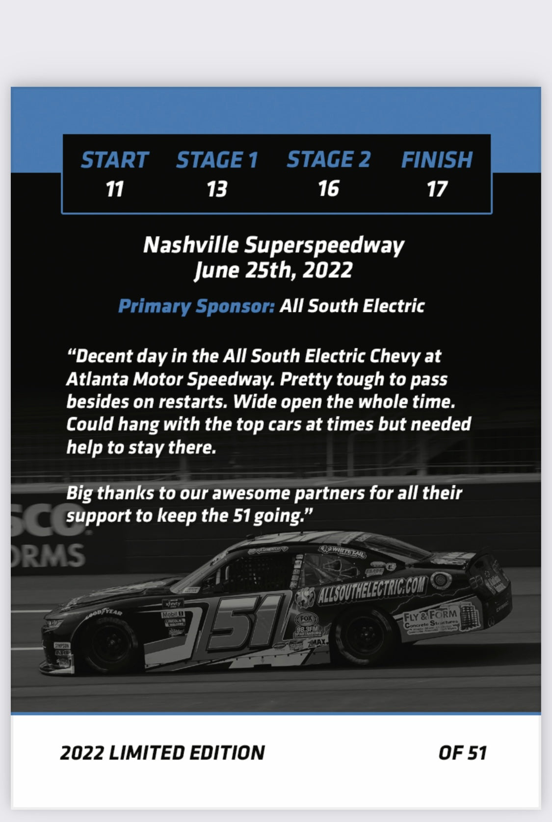 There will be 51 cards for each of the 33 races in 2022. Each card in the series will feature a photo from the race as well as a recap/highlights from the race as well as listing the starting and finishing position. Each card will be hand numbered “x of 51”. Jeremy will then sign each card.