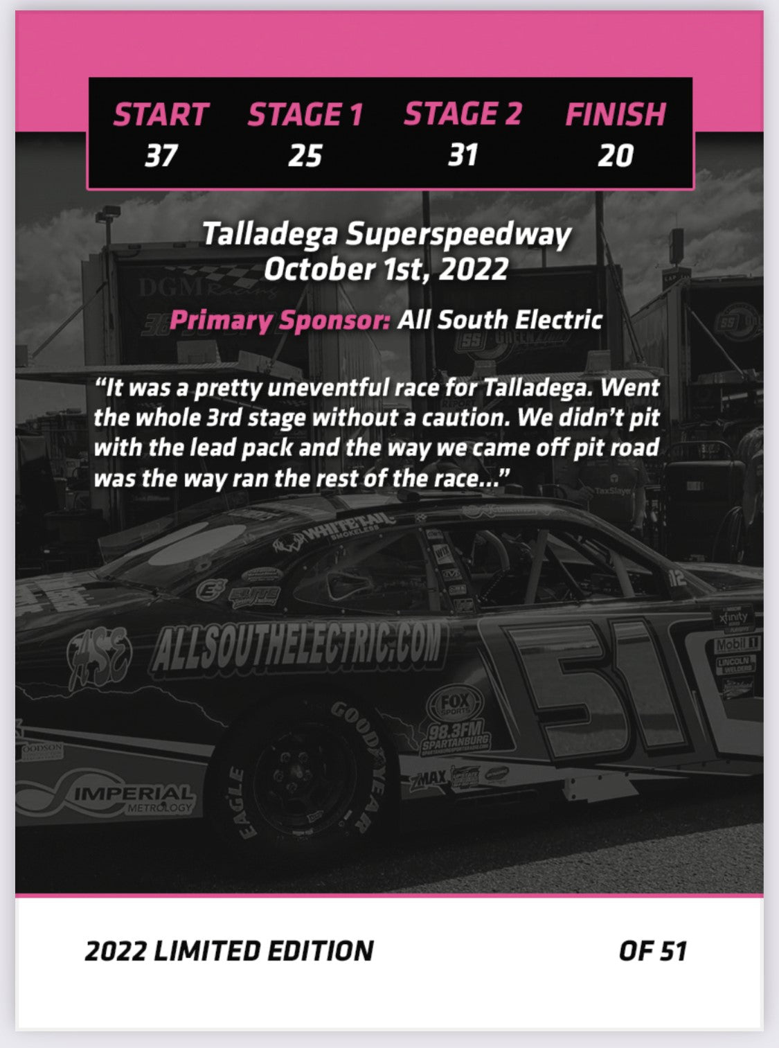 There will be 51 cards for each of the 33 races in 2022. Each card in the series will feature a photo from the race as well as a recap/highlights from the race as well as listing the starting and finishing position. Each card will be hand numbered “x of 51”. Jeremy will then sign each card.