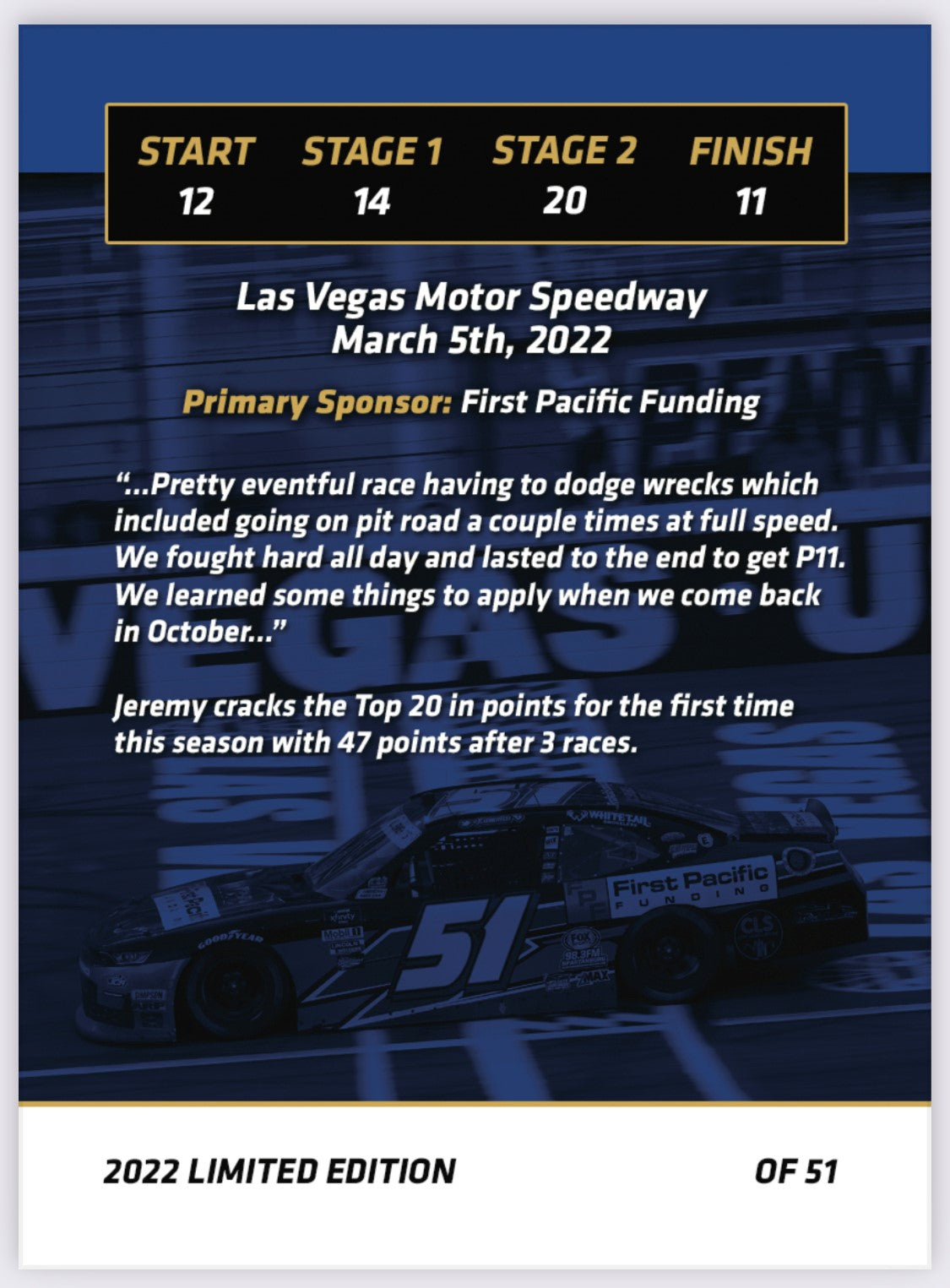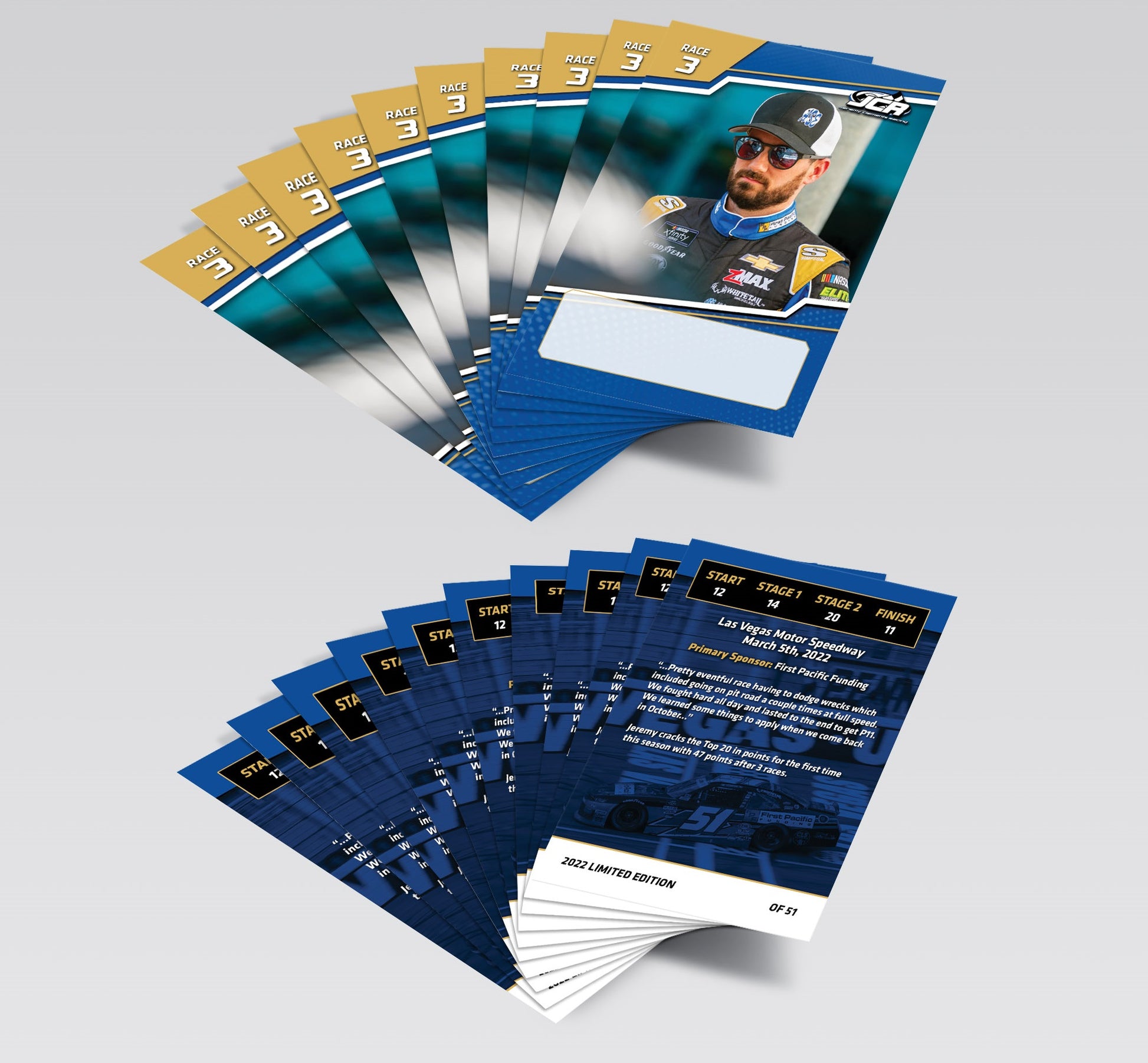 There will be 51 cards for each of the 33 races in 2022. Each card in the series will feature a photo from the race as well as a recap/highlights from the race as well as listing the starting and finishing position. Each card will be hand numbered “x of 51”. Jeremy will then sign each card.