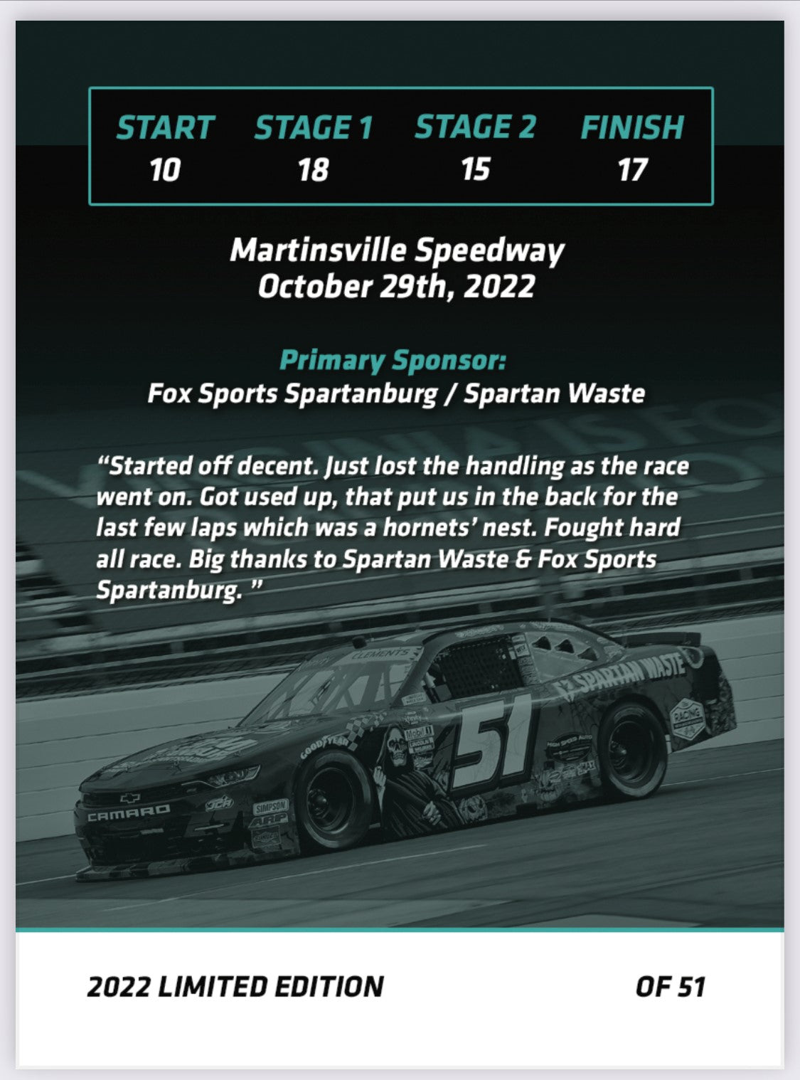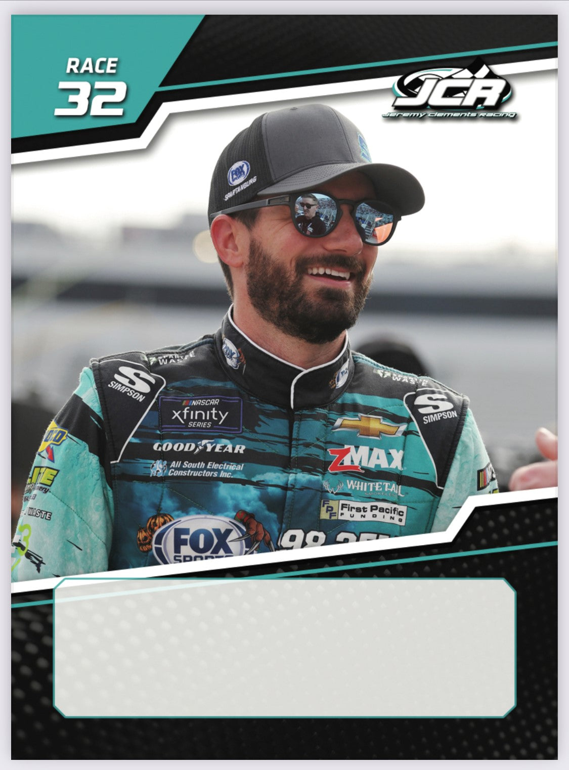 There will be 51 cards for each of the 33 races in 2022. Each card in the series will feature a photo from the race as well as a recap/highlights from the race as well as listing the starting and finishing position. Each card will be hand numbered “x of 51”. Jeremy will then sign each card.