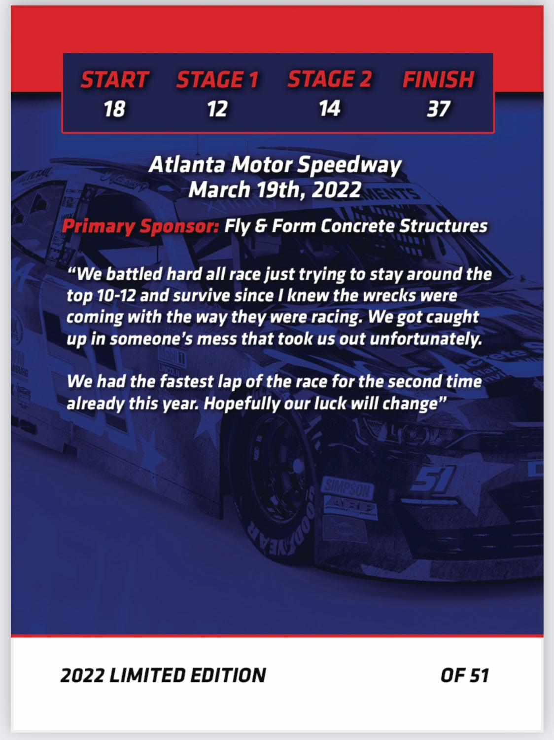 There will be 51 cards for each of the 33 races in 2022. Each card in the series will feature a photo from the race as well as a recap/highlights from the race as well as listing the starting and finishing position. Each card will be hand numbered “x of 51”. Jeremy will then sign each card.