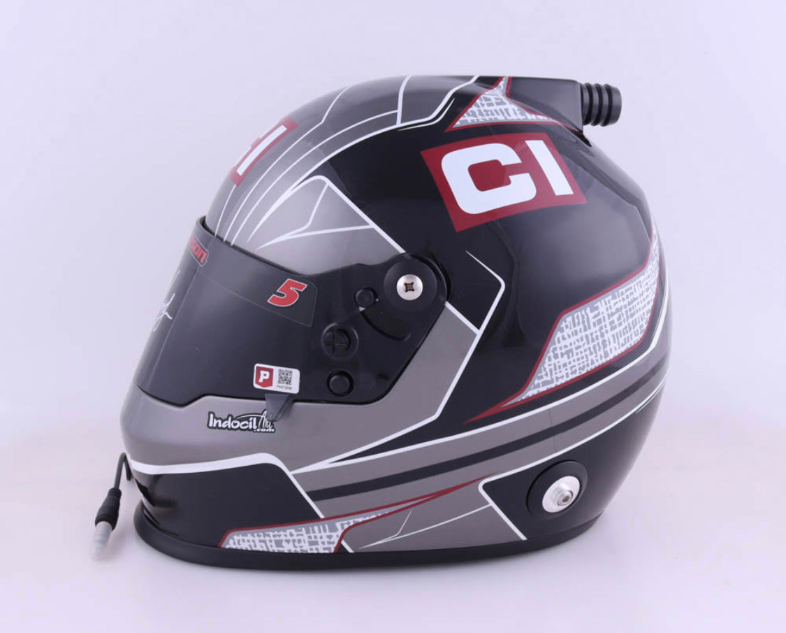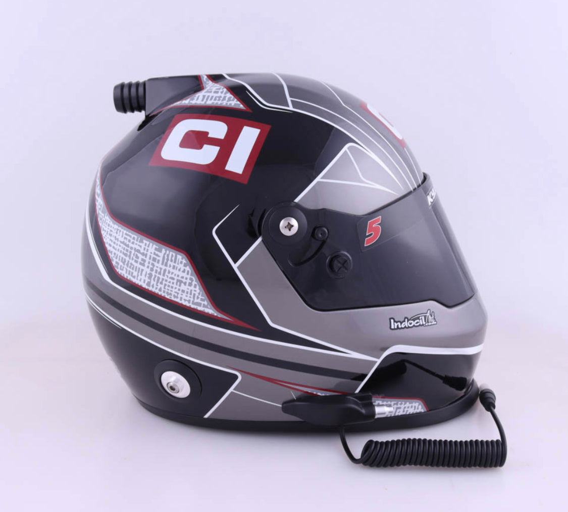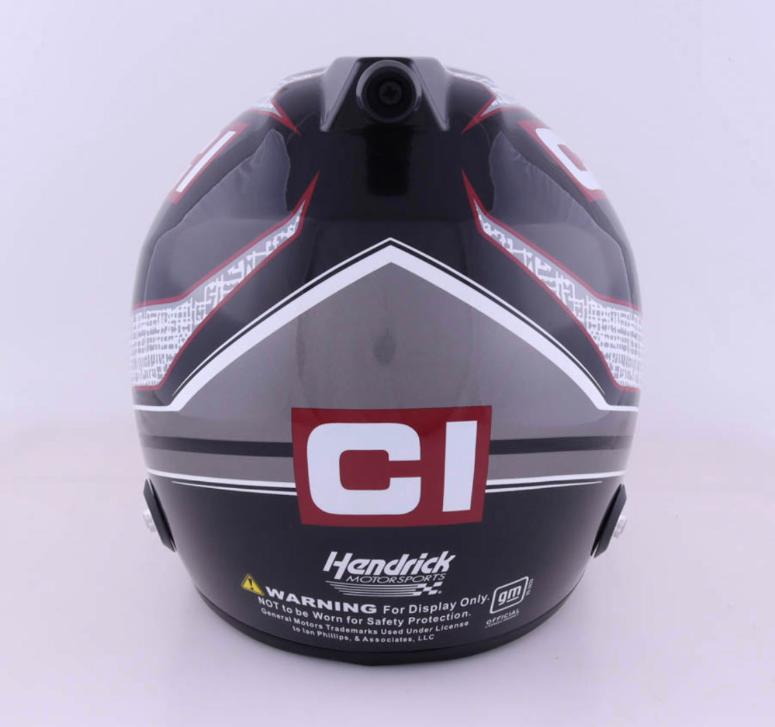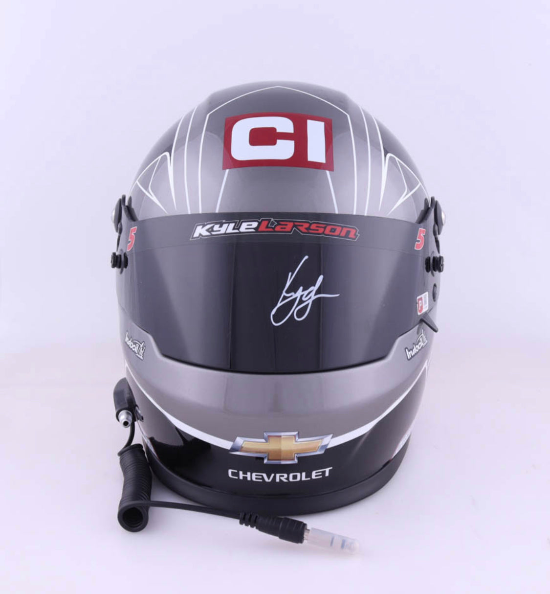 Full-size replica NASCAR helmet is hand-signed on the visor by Kyle Larson.